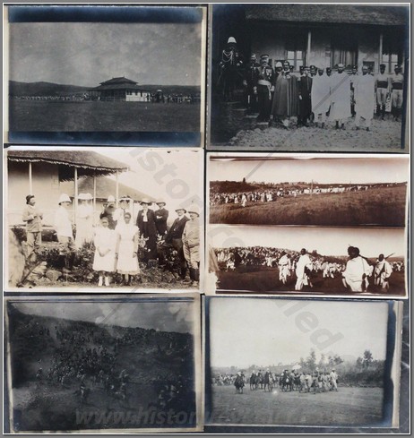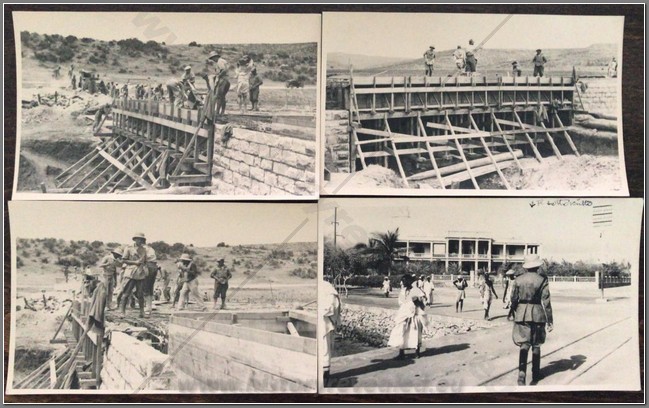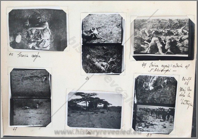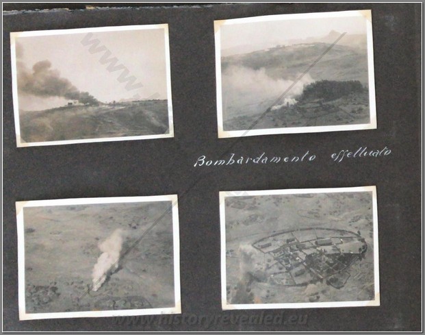 Beautiful photo album belonging to an Italian aviator Lieutenant Luciano Orlandini fighting in Ethiopia, 1935-1936, with the 3rd Air Brigade, 14th Bomber Squadron. He flew a Caproni Ca.101, which was used as both a transport and a bomber. On the inside cover he writes “The now legendary expertise and fearlessness of Italian aviators guarantee the safety and victory of the Fatherland in the skies”. Shown are his disassembled plane being offloaded at Massaua on December 9, 1935; he is shown frequently with local natives; he poses upon his return from flights to Axum, Asmara,Dessie, Gondar. He is based mainly in Axum throughout the war. He is shown showing off one of his bombs; posing with gold medal recipient Bombonati; numerous photos of Axum showing architecture, daily life, a funeral, showing where the Negus was crowned; military camp at Axum; rare photo of a tankette; named Eritrean ascaris; rare photo of the hanging of one of the “assasins” of the massacre at Mai Lola (Gondrand Massacre); repairing his plane; much fraternization with the local natives; visit by the Duca di Bergamo; spotting Starace’s column from the air’; very nice and very rare photos of the “La Disperata” Squadron, commanded by Mussolini’s son-in-law Count Ciano; extremely rare photo of one of Haile Selassies’ few airplanes, caption reads “the remains of the Potez of the Negus, bombed by our aircraft” (Note: Haile Selassie had only 24 planes in total. 6 of them were the Potez 25 A-2) which was most likely a Red Cross plane ETH 495ETH 495(see NOTE below); photo him with famed pilot Lieutenant Mendez as well as General Baccara; transporting Marshall Badoglio’s wife!!; photos of Starace; stacking bombs; a destroyed Caproni Ca. 111 light bomber; rare photo of Badoglio with Colonel Baistrocchi; shown with another Medagli d’oro recipient, Agostini; incredible aerial photos of the aerial bombing of Dabat on March 12, 1936; the hanging of the “assasins” involved in the Gondrand massacre; photo of General Liotta, supreme commander of the air force in East Africa; cemetery at Mai Lolo for the victims of the Gondrand Massacre; great views of Amba Alagi; on leave in Asmara; rare photo of tankettes with a plane from 118th Squadron at Addis Abeba; planes airbound to bomb Ras Immru at Gimma in November 1936 (one of the last holdouts, Ras Immru surrendered on December 19; aerial sortie sent to wipe out Ras Desta and the Dejasmatch Gabre Mariam who had assembled military forces in the Great Lakes district; loading bombs at Addis Abeba to hunt down Ras Immru; photo of an actual bomb release over Ras Immru’s camp in December; Addis Abeba military airstrip lined with tankettes and aerial bombs during the campaign to catch Ras Immru; incredible photos of Italian aircraft destroyed by rebels in Addis Abeba almost a full year after the war officially finished; incredible photo of a destroyed airplane of Haile Selassie’s Imperial Guard, with a note on it saying “Comrades the aviators present”; a visit to a remote western region Dembidollo in November; Café Romano in Addis Abeba;ETH 495ETH 495 Viceroy Graziani in Addis Abeba, December 5, 1936; aboard a train to Dire Daua and Djibouti mid December; voyage home. A remarkable album 426 photos, plus stationary from the Royal Palace and two news articles of pilots shown in the album. The most comprehensive album covering the air war in Ethiopia I have ever seen. It includes the bombing of a Red Cross plane and the hunting down of the villains of the Gondrand Massacre. It covers all major campaigns on the Northern Front and gives good account of chasing down Ras Immru, the last Ras to surrender. SOLD