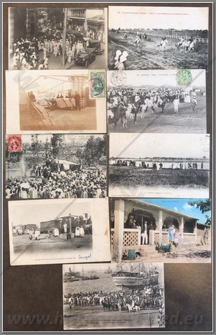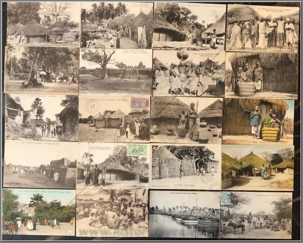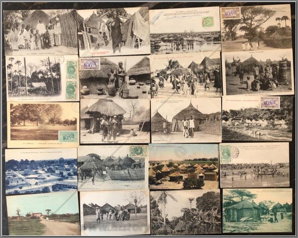 40 colonial postcards of different villages throughout Senegal. Name villages include Louga, Casamance, Kaolack, Kayes, Medina and a number of unknown villages. Also shown are villages of a certain ethnic group such as the Cerere, Diola, Fadiouth, Bambara, Ouolof, Toucouleur and Saussai. Interesting to compare different types of architecture and hut construction.