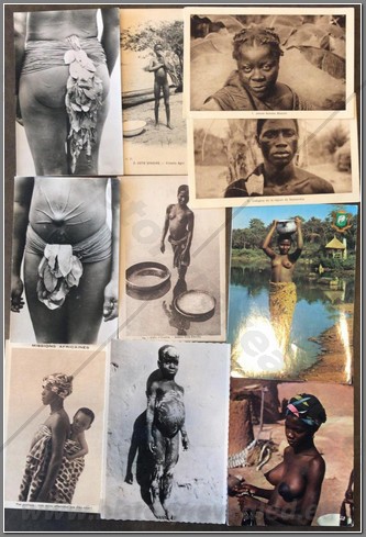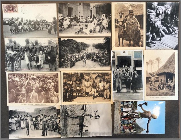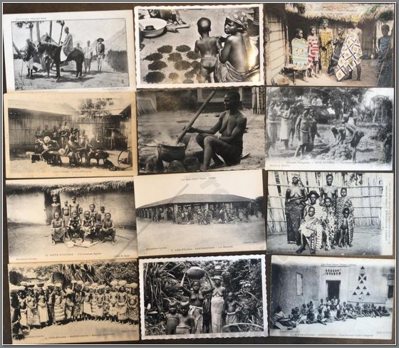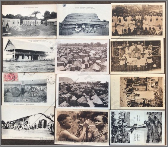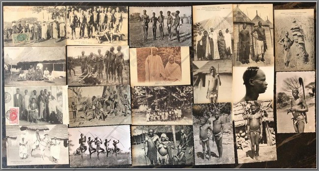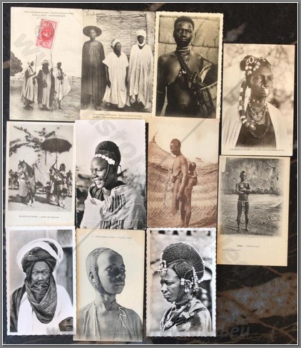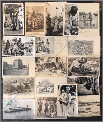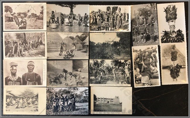 18 colonial postcards lo native life in Niger. Shown are a French colonial Mehariste, Djermas warriors, chiselling teeth, a Houssa musician, pounding manioc, going to market, local granary, hunting, fishing, interesting market, sorting produce, Christian children, mother giving baby an oral enema.