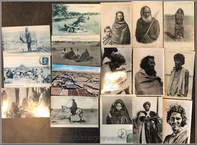 16 colonial postcards of Mauritania showing the life of the local population. Shown are practicing Islam, rare image of the training of local trailleurs by a French officer, ethnic Moroccans (tribes Trarza and Djijiba, rare image of a captured Moroccan woman, local market, nomad encampment, fishing, vue of Port Etienne and a photo souvenir around the time of Independence.