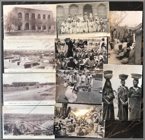 10 colonial postcards of life and colonial architecture of Zinder, Niger. Some with handwritten notations identifying specific buildings.