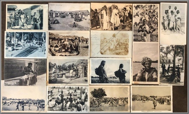 17 colonial postcards of various economic habits of the Somali people. Shown are weaving, farming, various different market types, herding.