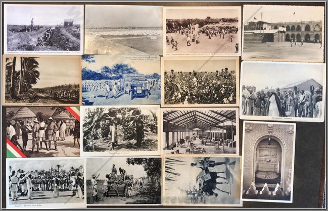 15 colonial postcards showing the interaction between the Italians and Somali natives as well as colonial structures and enterprises.