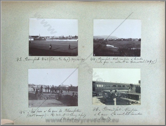 Spectacular photo album titled DU FRANCE AU SUD-AFRIQUE 1895. It records the travels of a Frenchman to Bloemfontein, Pretoria and Johannesburg as well as visiting the diamond mines of Kimberley and various gold mines. 200 photos in all, well and legibly captioned. The owner of the album was Mr. Bergson, who appears to be a senior executive in the diamond business. He visits the home of Isaac Dreyfus, founder of Messrs Dreyfus Bernheim & Co, and one of the 5 original members of the Diamond Buying Syndicate, which became the sole buyers of diamonds from De Beers. Numerous photos of different mines and the life of Zulus working the mines. The owner had a very good camera. A rare find showing the capitals of the two Boer States 5 years before the Boer War and various gold and diamond mines in their infancy.