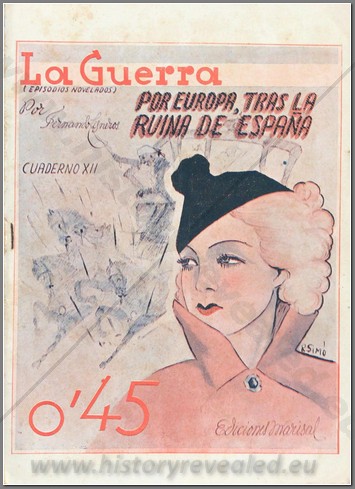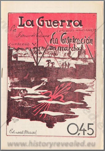 1937-1938 childrens coloring book by fascist artist Laokin. In 6 frames it glorifies the Nationalist cause, with marching off to war and supported by the people, the support from other fascist nations, triumph over animal-like communists, glorification of the Nationalist cause, Republicans cowtowing to the Nationists and Monarchists. Rare M ah kh
