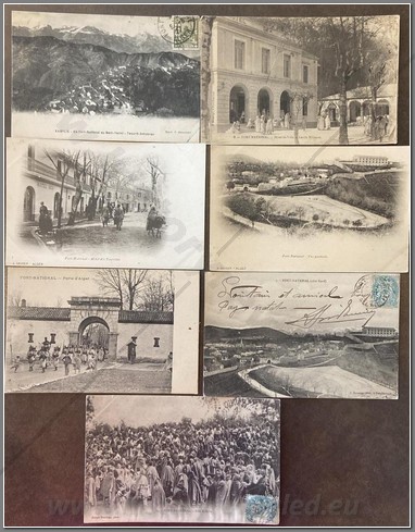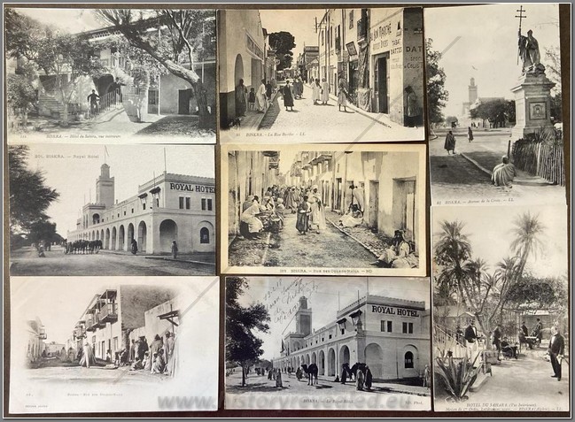 8 colonial postcards of Biskra. Architectural, colonial and local arab interest. A number of cards from the War of Independence period. A garrison town, Biskra was again the scene of anti-French assaults during the Algerian War of Independence where house-to-house battles cost many lives.