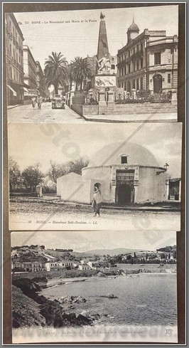 3 colonial postcards of Bone, now known as Annaba. Algeria’s leading industrial city, it was one of the main French settlements, and it still has a sizeable minority of the "Pied-Noir". One notable pied-noir from Bône was General Alphonse Juin, a Marshal of France and then the Central European NATO Commander. Architectural interest.
