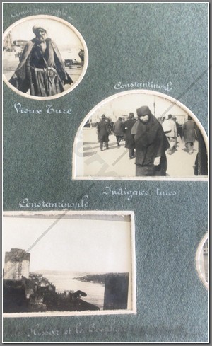 Photo album belonging to a French infantryman from WW1, showing mostly Constantinople with some photos from Szegedin, Hungary, Germany and Marsailles. Shows the barracks of Red Cross personnel in Constantinople, rare photo of French tanks at Constantinople, Gul-Hane hospital and garden, Galata from the Bosphorus, English hospital, French hospital ship, Therapia from the Bosphorus, Turkish women, Allied warships at the Pont de Serai, merchant ships at the Golden Horn, outdoor bazzar, preparing for prayers, various mosques and palaces, entrance to the Ministry of War, Eyoub and surrounding villages, views of Sirkedji, Istanbul streets, Gallipoli, Chanak, Pointe de Moda, Cadikeuy, parade of French troops in Pera, French troops and TANKS, Senegales French colonial troops waiting for soup aboard ship, French troops swimming in the Marmara Sea, more. All photos are captioned. 119 photos, of which 85 are of Constantinople.