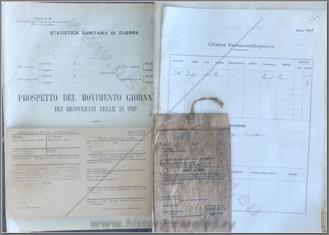 Documents spanning 56 years relating to the main hospital of Parma. 7 documents from the Dermo-Sifilopatica clinic, showing patient records. During WW1 the hospital was converted for military use and there are two blank forms for patient records dated 1936. Titled WAR HEALTH STATISTICS. DAILY MOVEMENT OF HOSPITALIZED PATIENTS IN THE 24 HOURS. It separates Italians from non-Italians and allies from enemies. At the time the form was printed, Italy was at war with Ethiopia. Lastly, the hospital was used by the American following the breach of the Gothic Line in 1944 and there is a shipment packet field medical card used by the Americans. These documents span three different periods in the hospital’s history, from the original 16th century construction to the new 20th century construction.