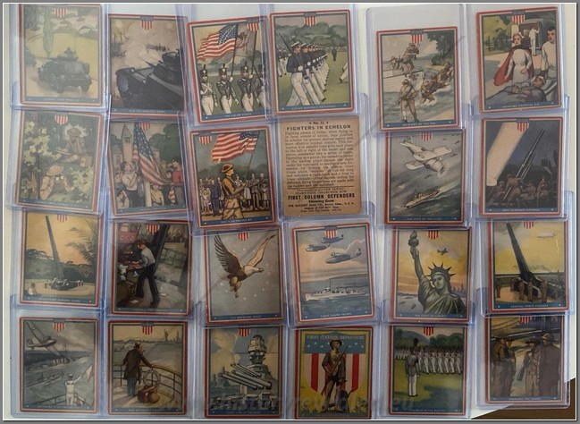 Complete set of 96 gum cards titled “Uncle Sam”. Issued by Gum Inc. of Philadelphia in 1941, it depicts four military branches of service: Army, Navy, Air Force and Marines. Because the series was distributed before direct U.S. involvement in WW2, the focus of the set was directed to U.S. preparedness for hostilities, and it is devoid of the vivid and horrifying details of the overseas warfare which was already taking place. “Uncle Sam” seems bland to many collectors compared to “Horrors of War” and “War Gum” and is generally in less demand than those two sets. The color artwork of cards 1-96, minus numbers 31 and 34, were reproduced in two small-sized books entitled “America’s Army” and “America’s Navy” (Rand McNally 1942). Some of the cards were also illustrated in a Planter’s Peanuts premium booklet distributed in the same time period. It also appears that all 96 cards were printed on two paper sheets, possibly to hang as advertising in store windows or to hand out as premiums. KH