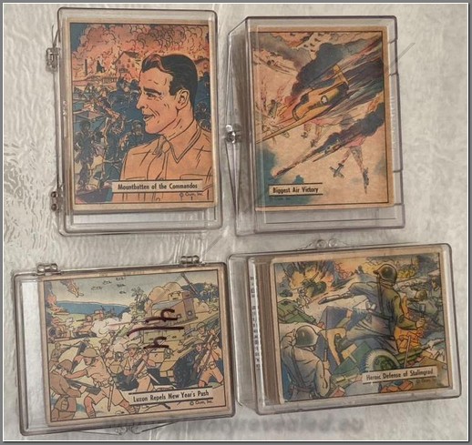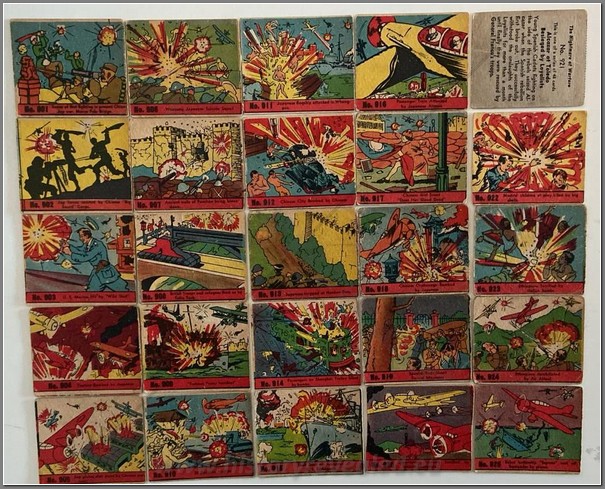 Complete set of 132 gum cards titled “War Gum”. This was the last great bubble gum card series to be issued in the U.S. before the war effort cut off all supplies of essential materials. Produced by Gum Inc’s. marvellous team J. Warren Bowman and George Moll, the 132 – card series began distribution in 1941 and continued well into 1942. This allowed the Gum Inc. art and writing teams to cover many of the current events of the war, to report the actions of the first American heroes, and to spotlight many Allied leaders as well. Compared to the “Horrors of War”, the artwork and write-ups of War Gum are far less graphic and concentrate not on enemy atrocities but on the bravery of Allied servicemen and leaders.
