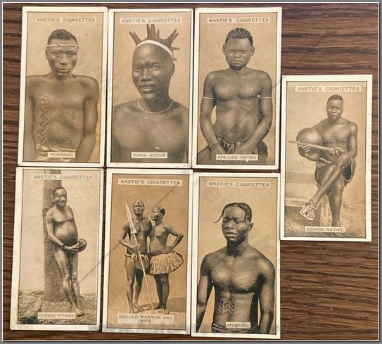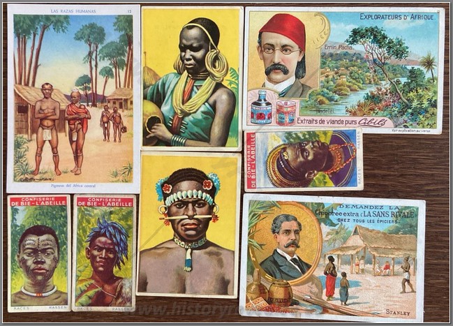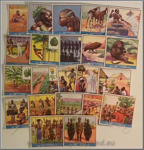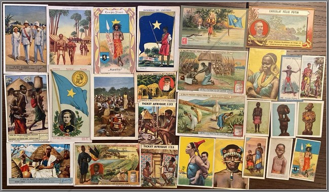 27 colonial period European chromos on the Belgian Congo. Coopers Tea, Baydex Cigarettes, Ogden’s Cigarettes, Nestle, Cafes Casino, Chocolat Pupier, Cote d’Or, Liebig Beef Extract, Chocolat Imperial, Chocolate Juncosa, Monte Christo Seife, Chocolate Amatller, Chocolat Klaus, Chocolat Felix Potin.