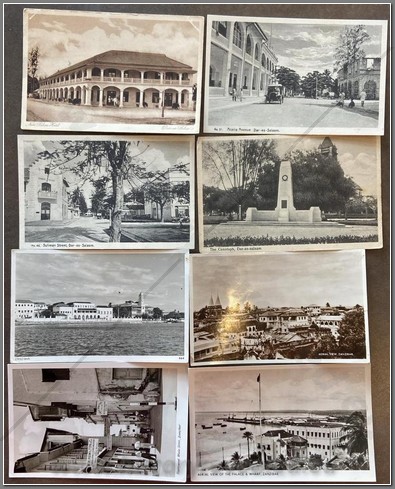 6 colonial postcards of the interaction between natives and colonials in Rhodesia, and what it produced. Shows a convent school in Bulawayo, tobacco auction at Salisbury, Victoria Falls Hotel, Shapiros Curio Store at Linvingstone, a missionary industrial school for the natives.