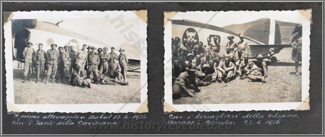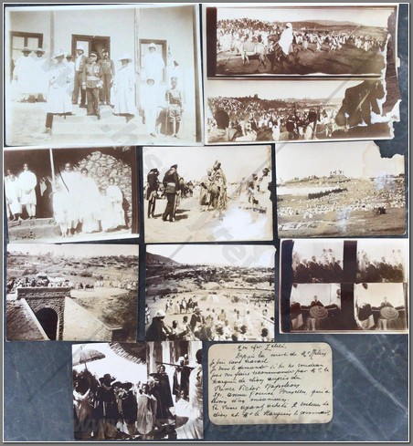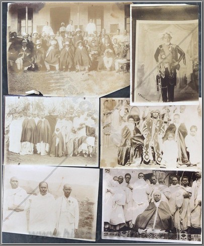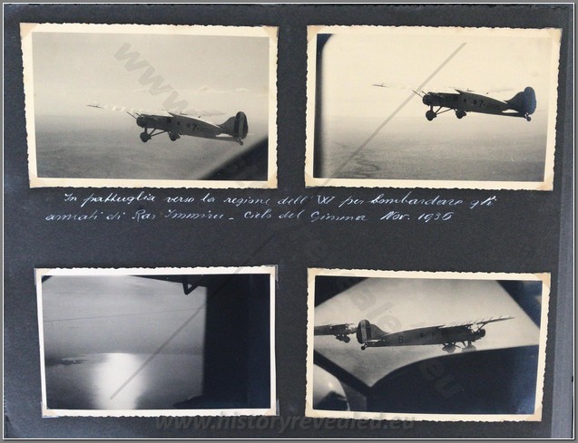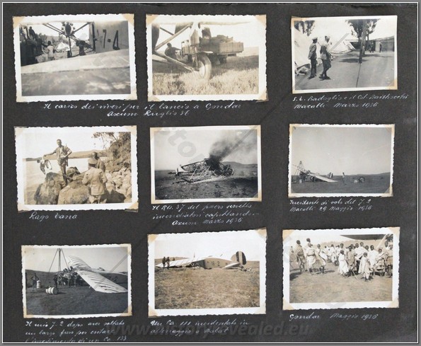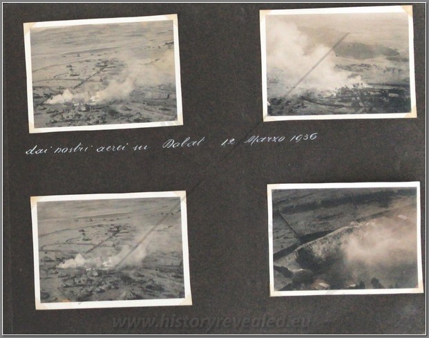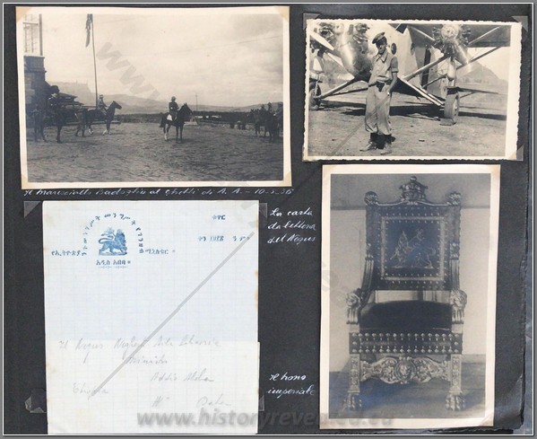 Beautiful photo album belonging to an Italian aviator Lieutenant Luciano Orlandini fighting in Ethiopia, 1935-1936, with the 3rd Air Brigade, 14th Bomber Squadron. He flew a Caproni Ca.101, which was used as both a transport and a bomber. On the inside cover he writes “The now legendary expertise and fearlessness of Italian aviators guarantee the safety and victory of the Fatherland in the skies”. Shown are his disassembled plane being offloaded at Massaua on December 9, 1935; he is shown frequently with local natives; he poses upon his return from flights to Axum, Asmara,Dessie, Gondar. He is based mainly in Axum throughout the war. He is shown showing off one of his bombs; posing with gold medal recipient Bombonati; numerous photos of Axum showing architecture, daily life, a funeral, showing where the Negus was crowned; military camp at Axum; rare photo of a tankette; named Eritrean ascaris; rare photo of the hanging of one of the “assasins” of the massacre at Mai Lola (Gondrand Massacre); repairing his plane; much fraternization with the local natives; visit by the Duca di Bergamo; spotting Starace’s column from the air’; very nice and very rare photos of the “La Disperata” Squadron, commanded by Mussolini’s son-in-law Count Ciano; extremely rare photo of one of Haile Selassies’ few airplanes, caption reads “the remains of the Potez of the Negus, bombed by our aircraft” (Note: Haile Selassie had only 24 planes in total. 6 of them were the Potez 25 A-2) which was most likely a Red Cross plane ETH 495ETH 495(see NOTE below); photo him with famed pilot Lieutenant Mendez as well as General Baccara; transporting Marshall Badoglio’s wife!!; photos of Starace; stacking bombs; a destroyed Caproni Ca. 111 light bomber; rare photo of Badoglio with Colonel Baistrocchi; shown with another Medagli d’oro recipient, Agostini; incredible aerial photos of the aerial bombing of Dabat on March 12, 1936; the hanging of the “assasins” involved in the Gondrand massacre; photo of General Liotta, supreme commander of the air force in East Africa; cemetery at Mai Lolo for the victims of the Gondrand Massacre; great views of Amba Alagi; on leave in Asmara; rare photo of tankettes with a plane from 118th Squadron at Addis Abeba; planes airbound to bomb Ras Immru at Gimma in November 1936 (one of the last holdouts, Ras Immru surrendered on December 19; aerial sortie sent to wipe out Ras Desta and the Dejasmatch Gabre Mariam who had assembled military forces in the Great Lakes district; loading bombs at Addis Abeba to hunt down Ras Immru; photo of an actual bomb release over Ras Immru’s camp in December; Addis Abeba military airstrip lined with tankettes and aerial bombs during the campaign to catch Ras Immru; incredible photos of Italian aircraft destroyed by rebels in Addis Abeba almost a full year after the war officially finished; incredible photo of a destroyed airplane of Haile Selassie’s Imperial Guard, with a note on it saying “Comrades the aviators present”; a visit to a remote western region Dembidollo in November; Café Romano in Addis Abeba;ETH 495ETH 495 Viceroy Graziani in Addis Abeba, December 5, 1936; aboard a train to Dire Daua and Djibouti mid December; voyage home. A remarkable album 426 photos, plus stationary from the Royal Palace and two news articles of pilots shown in the album. The most comprehensive album covering the air war in Ethiopia I have ever seen. It includes the bombing of a Red Cross plane and the hunting down of the villains of the Gondrand Massacre. It covers all major campaigns on the Northern Front and gives good account of chasing down Ras Immru, the last Ras to surrender. SOLD