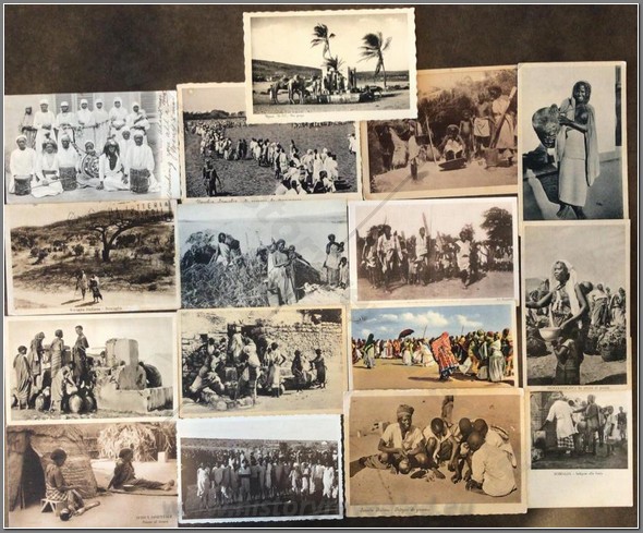 16 colonial postcards of various social habits of the Somali people. Shown are a female musician, watering camels, indigenous games, local fantasia, drawing water, local school, female toilet, cooking, local musicians.
