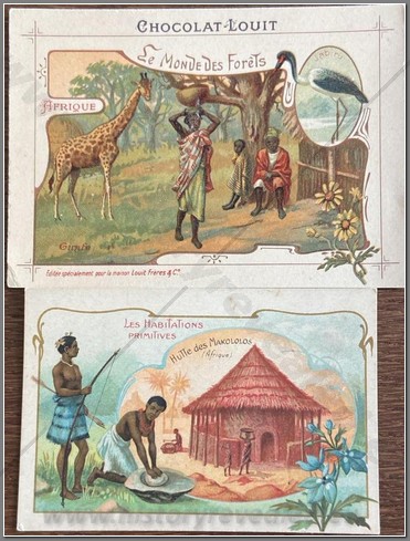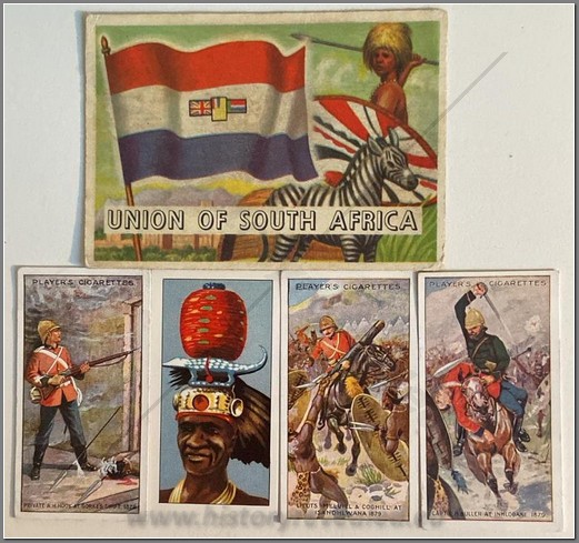 21 European chromos of Boer culture and the Boer. The French and German support for the Boers is evident, with one confectioner showing a Boer hurling chicoree at the British. In another case a Boer is presenting a Zulu with a package of biscuits. Paul Mairess Chicoree, Ogden’s Cigarettes, Will’s Cigarettes, Player’s Cigarettes, Helmar Cigarettes, Recruit Little Cigars, Peek Frean & Co., Cacao Suchard, Aecht Seelig’s Stern Kaffee, Amidon Remy, Solution Pautauberge (in Greek).