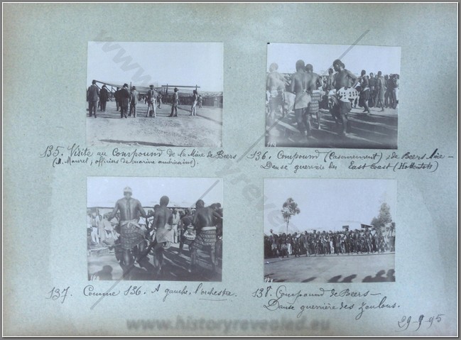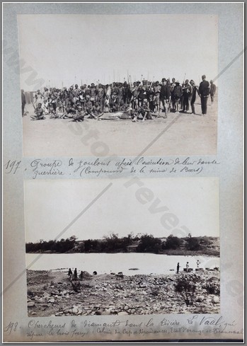 Spectacular photo album titled DU FRANCE AU SUD-AFRIQUE 1895. It records the travels of a Frenchman to Bloemfontein, Pretoria and Johannesburg as well as visiting the diamond mines of Kimberley and various gold mines. 200 photos in all, well and legibly captioned. The owner of the album was Mr. Bergson, who appears to be a senior executive in the diamond business. He visits the home of Isaac Dreyfus, founder of Messrs Dreyfus Bernheim & Co, and one of the 5 original members of the Diamond Buying Syndicate, which became the sole buyers of diamonds from De Beers. Numerous photos of different mines and the life of Zulus working the mines. The owner had a very good camera. A rare find showing the capitals of the two Boer States 5 years before the Boer War and various gold and diamond mines in their infancy.
