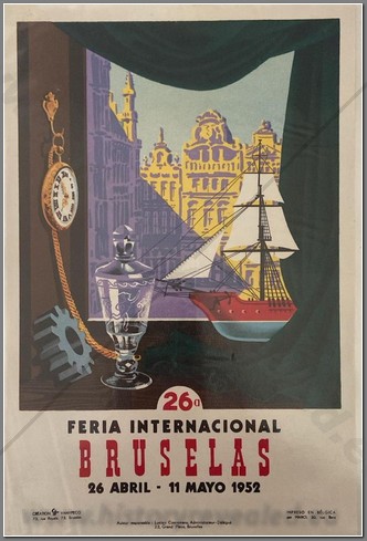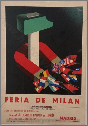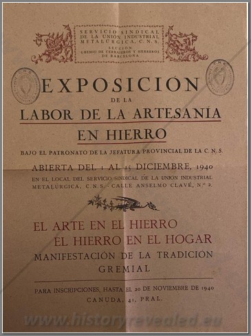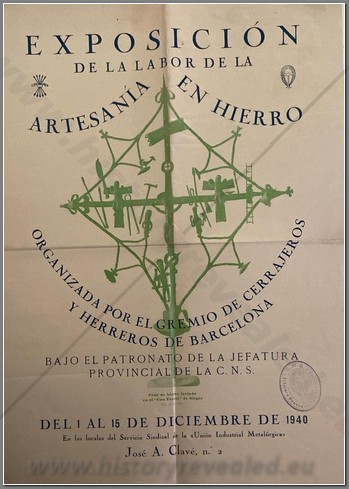 Poster for the Barcelona Exposition of the works of iron craftsman, put on by the Barcelona Blacksmith’s Guild. It ran from December 1-15, 1940, and was sponsored by the Union of Industrial Metallurgists. Note the stamp of the C.N.S. 32X44CM.
