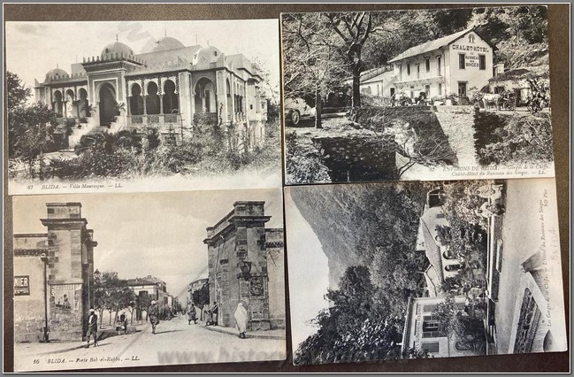 4 colonial postcards of Blida and nearby Chiffa Gorge. Architectural, colonial and local arab interest. Blida is surrounded by a wall of considerable extent, pierced by six gates, and is further defended by Port Mimieh, crowning a steep hill on the left bank of the river. The nearby Chiffa gorge is one of the few habitats of the endangered Barbary macaque.