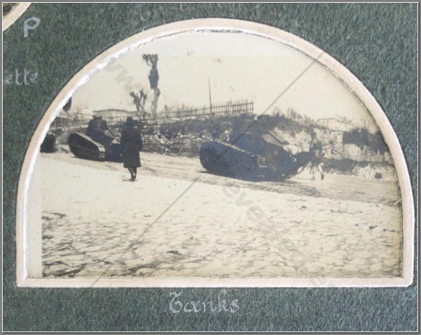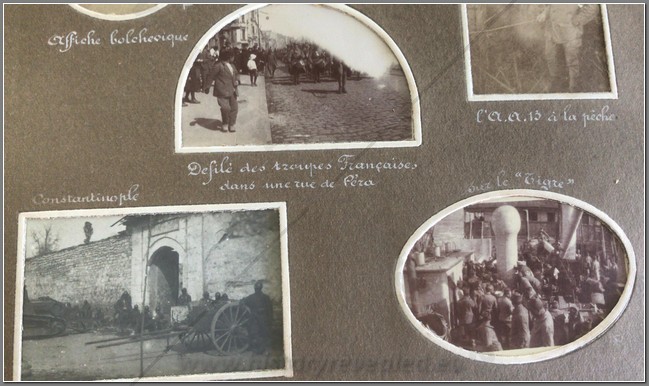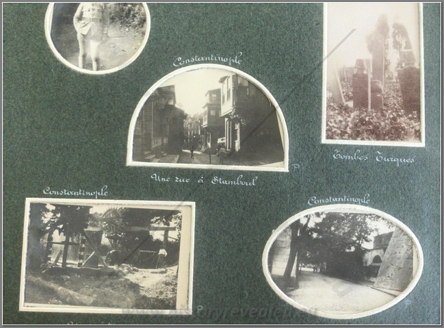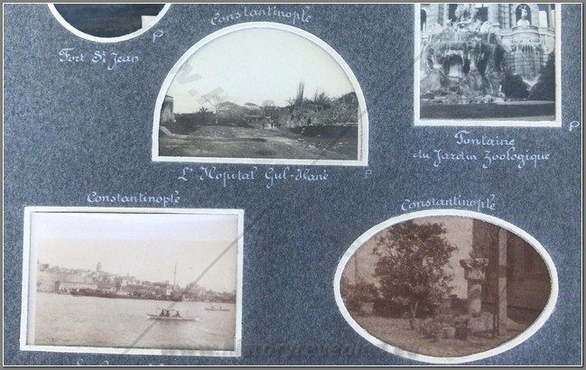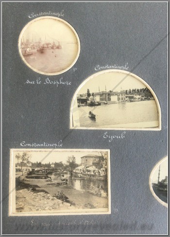 Photo album belonging to a French infantryman from WW1, showing mostly Constantinople with some photos from Szegedin, Hungary, Germany and Marsailles. Shows the barracks of Red Cross personnel in Constantinople, rare photo of French tanks at Constantinople, Gul-Hane hospital and garden, Galata from the Bosphorus, English hospital, French hospital ship, Therapia from the Bosphorus, Turkish women, Allied warships at the Pont de Serai, merchant ships at the Golden Horn, outdoor bazzar, preparing for prayers, various mosques and palaces, entrance to the Ministry of War, Eyoub and surrounding villages, views of Sirkedji, Istanbul streets, Gallipoli, Chanak, Pointe de Moda, Cadikeuy, parade of French troops in Pera, French troops and TANKS, Senegales French colonial troops waiting for soup aboard ship, French troops swimming in the Marmara Sea, more. All photos are captioned. 119 photos, of which 85 are of Constantinople.