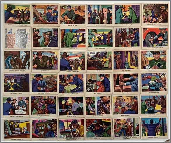 The full title of the Bowman set is “AMERICA SALUTES THE FBI – HEROES OF THE LAW.” It consists of 36 pastel color drawings depicting famous cases and arrests, with details and text supplied by “G-Men Detective Magazine”. The fronts have white borders, and the card caption is printed in the large border underneath the picture. The caption also appears on the reverse, along with the card number and text. The cards are found with both white and gray backs; blank and transposed backs (containing text from other Bowman sets) have also been found. The set was issued in 1949. Complete set of 36.