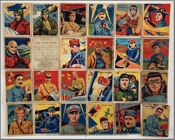 Although a line on some of National Chicle’s “SKY BIRDS” cards advertise “a series of 144”, there were only 108 titles issued. The subjects are famous pilots and airplanes; cards 1-24 are dated 1933 and cards 25-108 are dated 1934. In recent times, collectors have noted print variations on back which suggest that the series may have been reissued and this is currently being studied. Artwork variations have also been reported. This collection contains 72/108 cards.