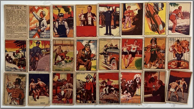 The “I’M GOING TO BE” series of 25 cards was a Schutter-Johnson product issued in a one-cent wax paper candy pack. The color artwork cards depict people of different vocations in the foreground, with background scenes related to each specific job. A blue frame line and white borders surround the picture. The back has a snappy description of the subject and also bears the card number. Backs also carry advertising for various premiums offered to anyone completing a set. This was made virtually impossible since card No. 4 was distributed on an extremely limited basis. Winners had their sets returned to them with the scarce card hole-punched and stamped “VOID”. This collection contains 24/25 cards, missing the scarce No. 4 card.