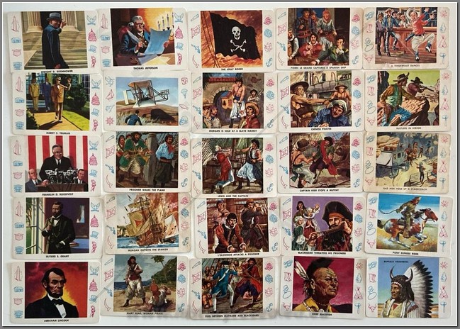 In 1940, many Americans were preoccupied with our country’s defenses, which, according to Goudey Gum’s “FIRST COLUMN DEFENDERS”, were pretty strong. Each card front contains a multi-color drawing surrounded by red, white and frame-lines. The back text, which can be found printed in either blue or black ink, is intensely patriotic and often includes quotes from famous American soldiers and writers. The wrapper is an example of pre-war hysteria, stating that “The purpose of this card series is to kindle a deeper sense of patriotism by portraying the ideals and principles on which our country is founded. FIRST COLUMN is the OPPOSITE of Fifth Column!!”. Complete set of 24.