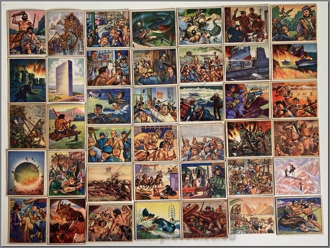 Complete set of 96 gum cards titled “Uncle Sam”. Issued by Gum Inc. of Philadelphia in 1941, it depicts four military branches of service: Army, Navy, Air Force and Marines. Because the series was distributed before direct U.S. involvement in WW2, the focus of the set was directed to U.S. preparedness for hostilities, and it is devoid of the vivid and horrifying details of the overseas warfare which was already taking place. “Uncle Sam” seems bland to many collectors compared to “Horrors of War” and “War Gum” and is generally in less demand than those two sets. The color artwork of cards 1-96, minus numbers 31 and 34, were reproduced in two small-sized books entitled “America’s Army” and “America’s Navy” (Rand McNally 1942). Some of the cards were also illustrated in a Planter’s Peanuts premium booklet distributed in the same time period. It also appears that all 96 cards were printed on two paper sheets, possibly to hang as advertising in store windows or to hand out as premiums. KH