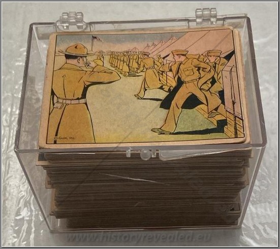 Complete set of 132 gum cards titled “War Gum”. This was the last great bubble gum card series to be issued in the U.S. before the war effort cut off all supplies of essential materials. Produced by Gum Inc’s. marvellous team J. Warren Bowman and George Moll, the 132 – card series began distribution in 1941 and continued well into 1942. This allowed the Gum Inc. art and writing teams to cover many of the current events of the war, to report the actions of the first American heroes, and to spotlight many Allied leaders as well. Compared to the “Horrors of War”, the artwork and write-ups of War Gum are far less graphic and concentrate not on enemy atrocities but on the bravery of Allied servicemen and leaders.
