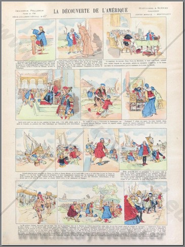 Late 19th/early 20th century Pellerin print by Imagerie D’Epinal. Titled La Decouverte de L’Amerique. NC